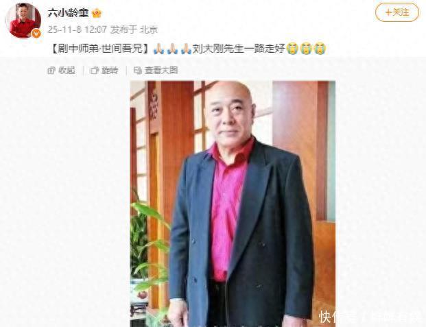 11񀙘日中午,六小龄童发文悼念《西游记续集》沙僧的扮演者刘大刚:       【剧中师弟·世间吾兄】刘大刚先生一路走好       11񀙗日,戏曲演员刘冰通过微博透露,著名表演艺术家、《西游记续集》沙僧的扮演者刘大刚��񀙓日在京病逝,享�岁。       据悉,六小龄童与刘大刚曾多次合作,在《西游记续集》《吴承恩与西游记》《敢问路在何方》《财迷》等作品中分别饰演孙悟空和沙僧。六小龄童曾提及刘大刚很爽快地答应参演《吴承恩与西游记》,且没有谈任何条件。       公开资料显示,刘大�𻂍�日出生于北京,一级演员。他在成为影视剧演员前是中国京剧院的戏曲演员,行当是花脸,在京剧舞台上摸爬滚打了几十年。90年代,刘大刚开始涉足影视创作,后在《西游记续集》中饰演沙僧,从而被观众熟知。       刘大刚曾回忆:当年拍摄时,自己身上的耳环񀙝两重、佛񈛅公斤、挑的担�多公斤,师徒四人脸上每天都得粘大量的胶水,16集戏历时一年半拍完。       1988年,二十五集电视连续剧《西游记》在中央电视台正式播出,该剧一经播出就在全国范围内引起轰动,造就�.4%的收视神话。2000年,十六集《西游记续集》播出,弥补了老版剧集的遗憾。《西游记》作为国产电视剧的精品,影响了几代人。       刘大刚还曾出演过电影《倚天屠龙记之魔教教主》;在央视版《三国演义》中饰孙綝;在金庸武侠剧《书剑恩仇录》中饰康熙;在刘晓庆主演的历史剧《武则天》中饰韩瑗;在古装剧《宰相刘罗锅》中饰许明堂。       六小龄童曾说,刘大刚是个非常憨厚的人,还是个热心肠,看到需要帮一把的,他都会主动上去帮忙。       2009𻂌�日,86版《西游记》中沙僧的扮演者闫怀礼因肺部感染去世,享�岁。
